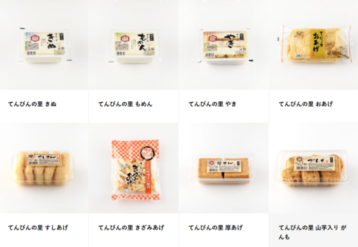 絹ごし豆腐、もめん豆腐、やき豆腐、おあけ、すしあげ、がんも、ひりょうず など